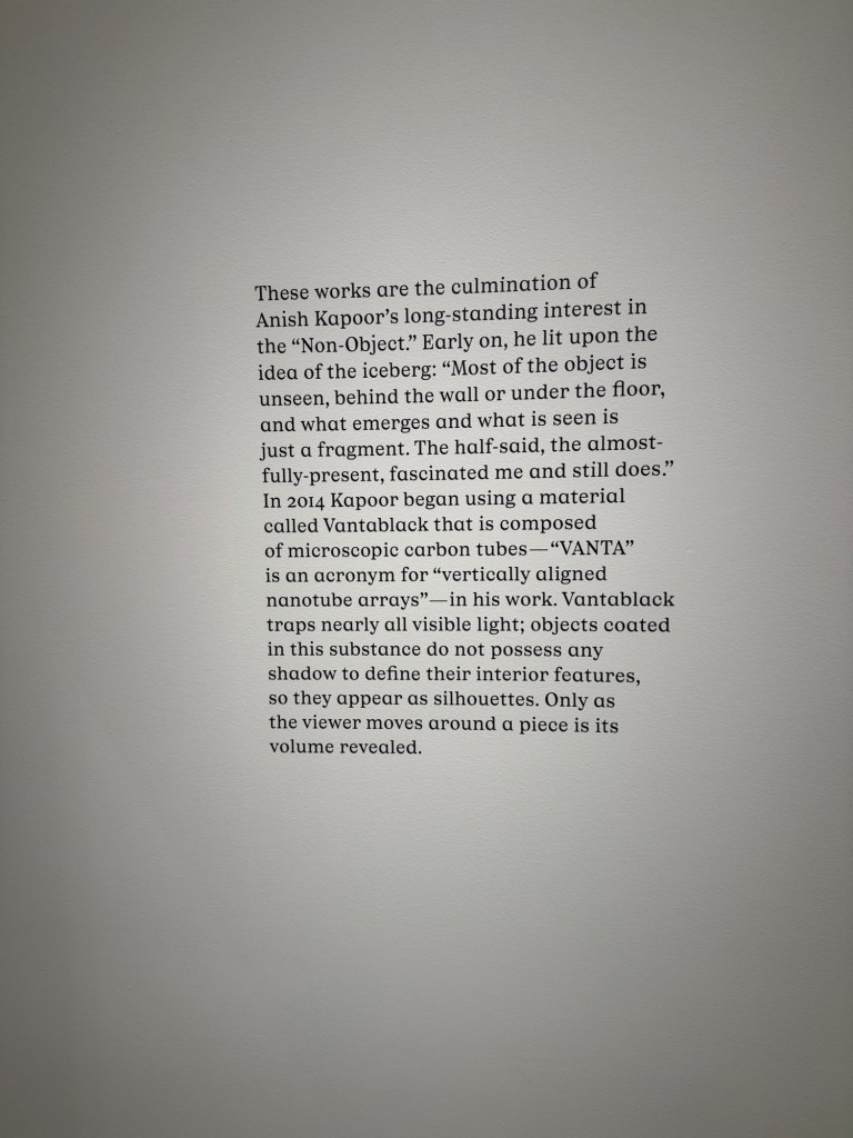 Anish Kapor exhibit at the Jewish museum. Went especially to see the VANTABLACK, known as the blackest black there is and owned by him; explained in the wording below