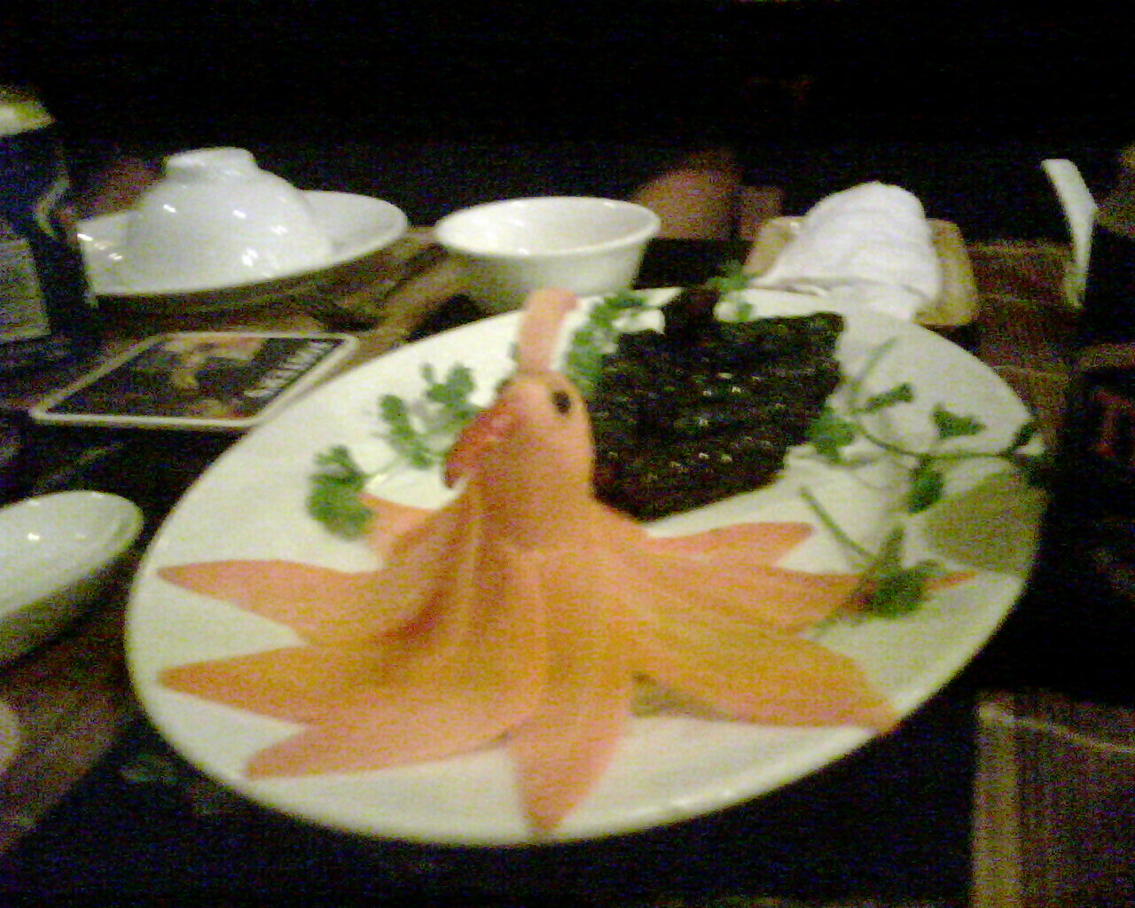Notice especially the presentation. Carved veggies with each of the dishes. Beautiful work with carrots and white raddishes etc.