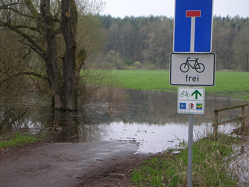 Longer ride so more variety. Portage (picture included), fording (picture), long portage as road flooded, sun, rain, hail (yes hale), fog, mud – lots of it, much of it on us, hills and valleys, wonderful views and wet feet (see above), significant routing help from gps, hotel on small mountain (berg), Schwabian dinner (photo), pastry shop in Riedlingen (picture) , interesting German accents, spring garden (picture)
