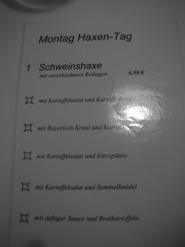 Menu tonight at the local restaurant included Pigs Foot Monday (very good value at Euro 6,90, although we failed to order any). The menu is included (pic), as well as our meals, good and generous. No way would the Swabians dare to say that American portions are large. Finished with some possibly local Schnappes or Grappa, made of pears; head clearing. Watched a guy eat the pigs foot, methodically clearing the meat and fat from the bone, adding potatoes to the plate, then slowly consuming everything but the bone. Two beers to wash it down.