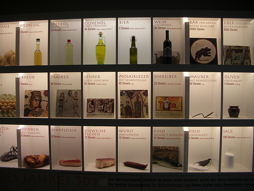 They include a visit to the Roman period museum (tourist interests expand dramatically on three day holiday weekends when virtually nothing is open). Museum turned out to be mildly interesting, especially their attempt to put up foods, stuff, and items of the time with prices in Denara. Could compare the price of a chicken and a beer and an egg with a slave or lion for the arena. Some pictures were taken, not sure if you will be able to resolve the prices. At the front desk I asked for additional literature or a postcard or pamphlet etc. on this portion of the museum.