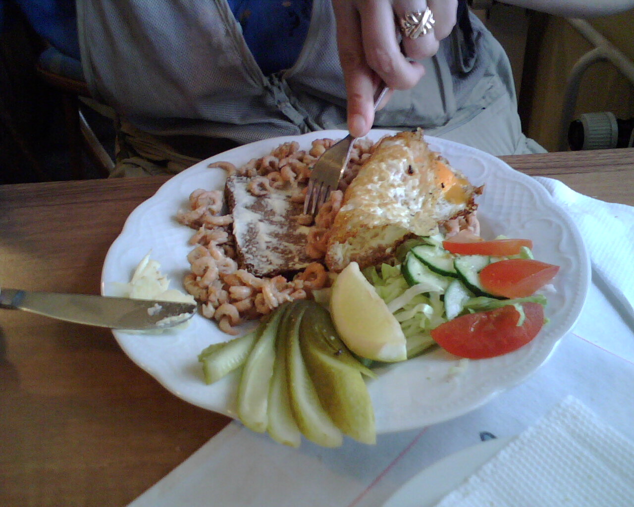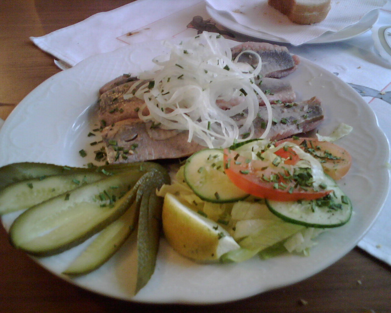 Herring heaven. The first place, and everyplace, we visited had about 10 types with several presentations of each. blackbread , sandwiches with onion and tomatoes. Smoked fish and eel. Fish smoke houses. Fast food and restaurants. Dock food. Shelves of salad concoctions with sauces , including curries.