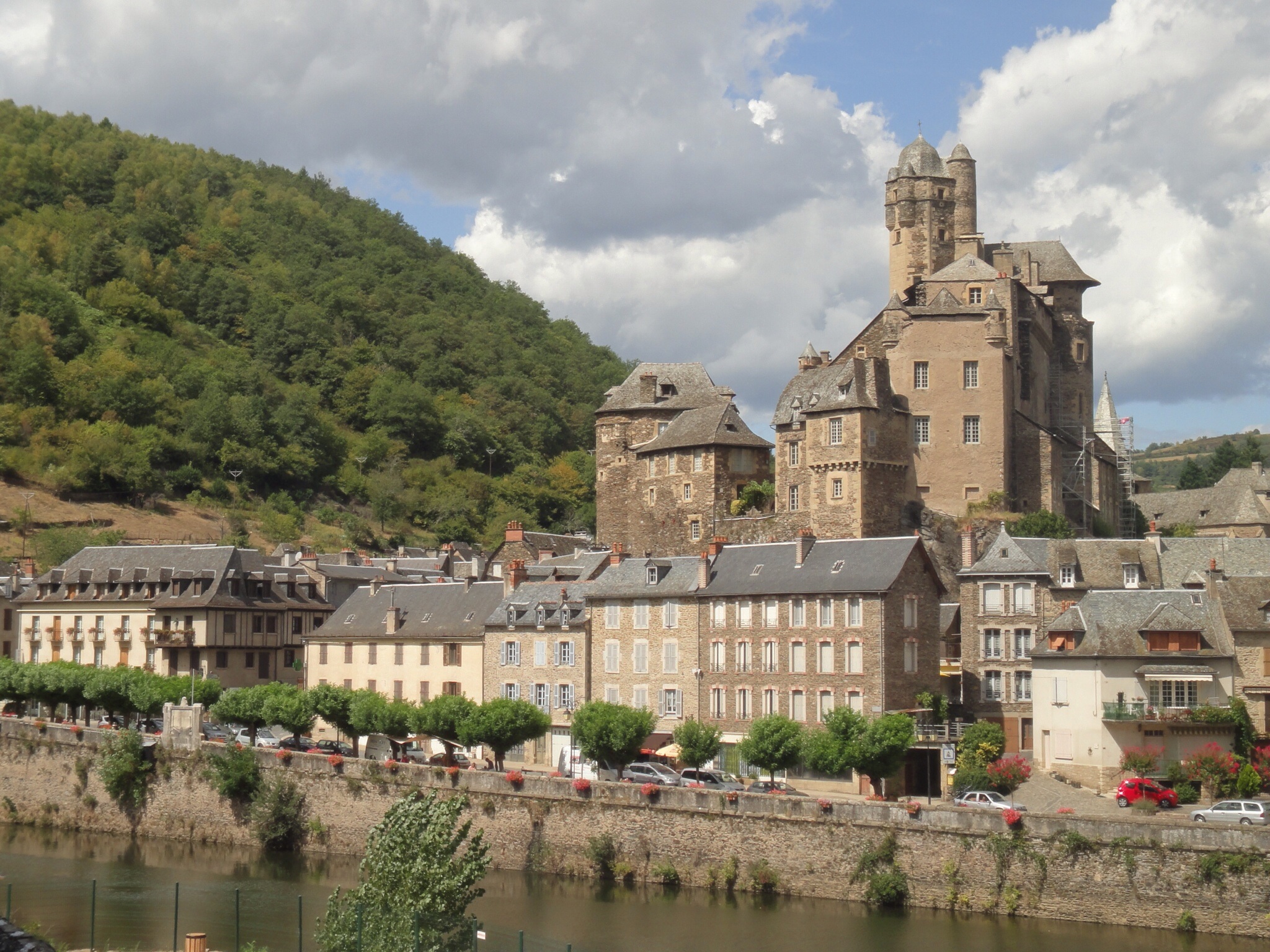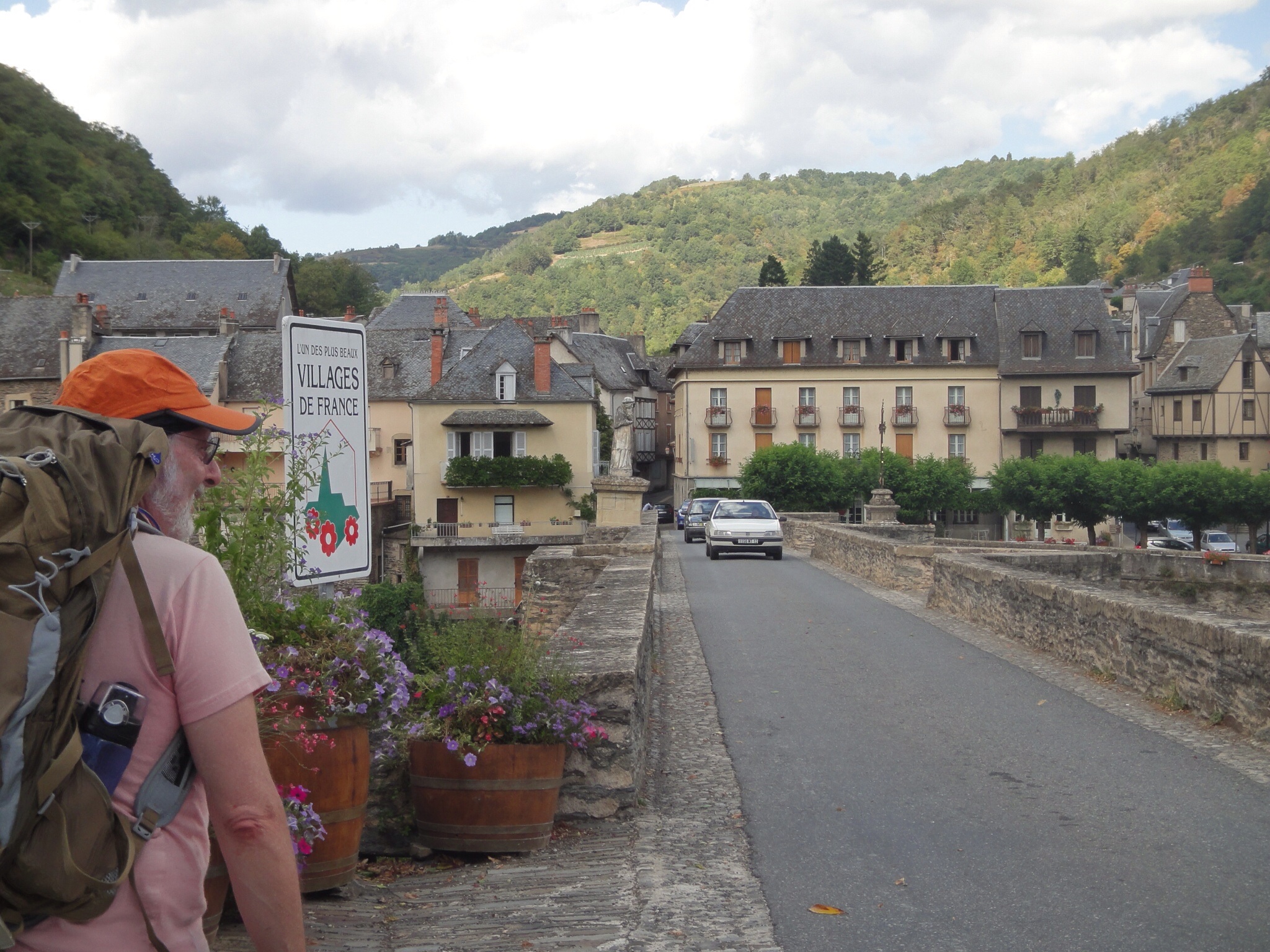 Hiked from Espalion to Estaing. Should have been easy except certain pilgrims blindly followed the signs instead of the maps, which would have showed me a nice flat road, and was forced to climb what was effectively a 2mile vertical wall of red dirt with few footholds. After a few feet, realized error, but was too afraid to roll back down so had to keep going. Near death at top (guidebook: "good views all round." Idiots!). Staggered into Estaing, lovely town (see photos, apparently the town council thinks so too). Met Ian (intrepid Aussie pilgrim, bothered by no road), who could not believe I had climbed the stupid hill. Even he had wisely taken the road. We were also concerned about Ann and two German pilgrims (Erika and Trautha??) who had not yet arrived (I'm pretty slow). After being told that an empty table for 6 could not be used because we were three, we sat around. Ann staggered in about 30min later, having been suckered by the same hill. She claimed to have climbed it literally on hands and knees because of the backpack weight. The Germans turned up after a bit, also sucker punched and not impressed by the views. Taxi for me to Golinhac via bike repair truck. Couldn't walk any more.