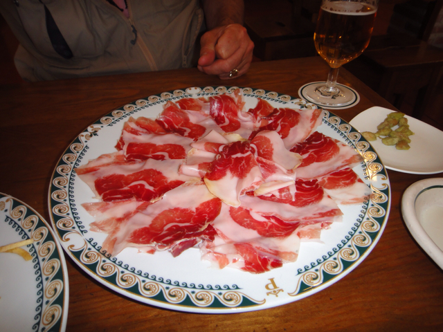 Jamon Iberico was purchased at great expense. Served with a salsa (closely resembling aioli) made of eggs, oil, salt, pimento, and a small amount of garlic. One takes the salsa and puts it on the provided toast slices and then piles on the ham. We removed much of the fat so we had, on average, about a half portion by weight. Not the least bit stringy, very smooth. Quite enjoyable and a nice treat.