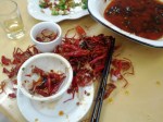 Lunch was another learning experience. A pot of treatment, steaming, on the table and a metal bowl maybe a half liter. One washes your rice bowl and chopsticks in the tea by pouring tea over the chopsticks while they are in the empty rice bowl. Then pour out the liquid into the metal bowl and repeat.