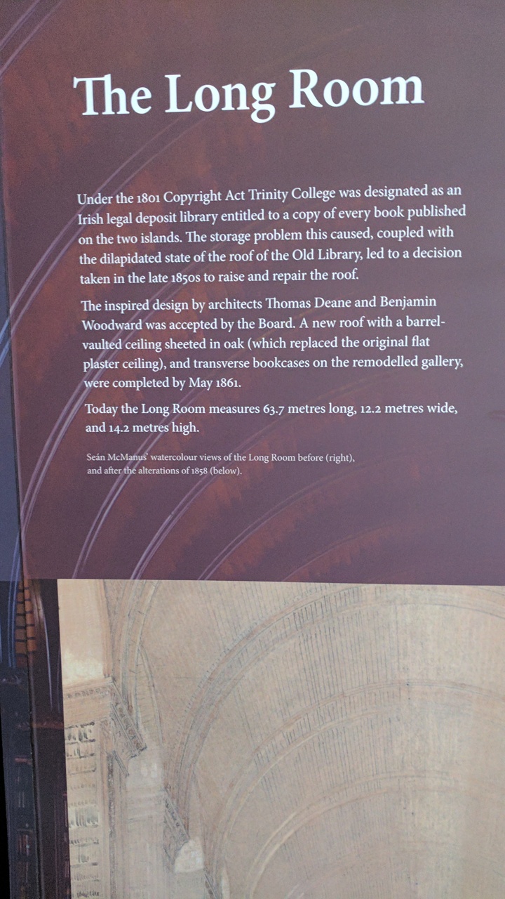 Library where the book of Kells is exhibited. There is a fine exhibition, no photos allowed, giving the history of the illustrated works of the period. Well documented and presented. The book is, of course, in a sealed display case. Surprisingly bright colors.