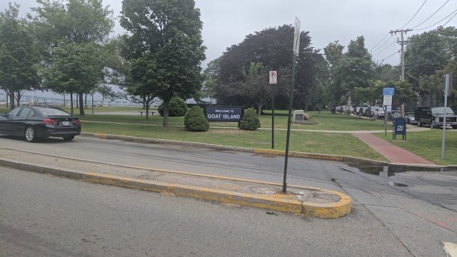 Goat Island. Not much here, mostly an upscale hotel. Small sign. Nice ships.
