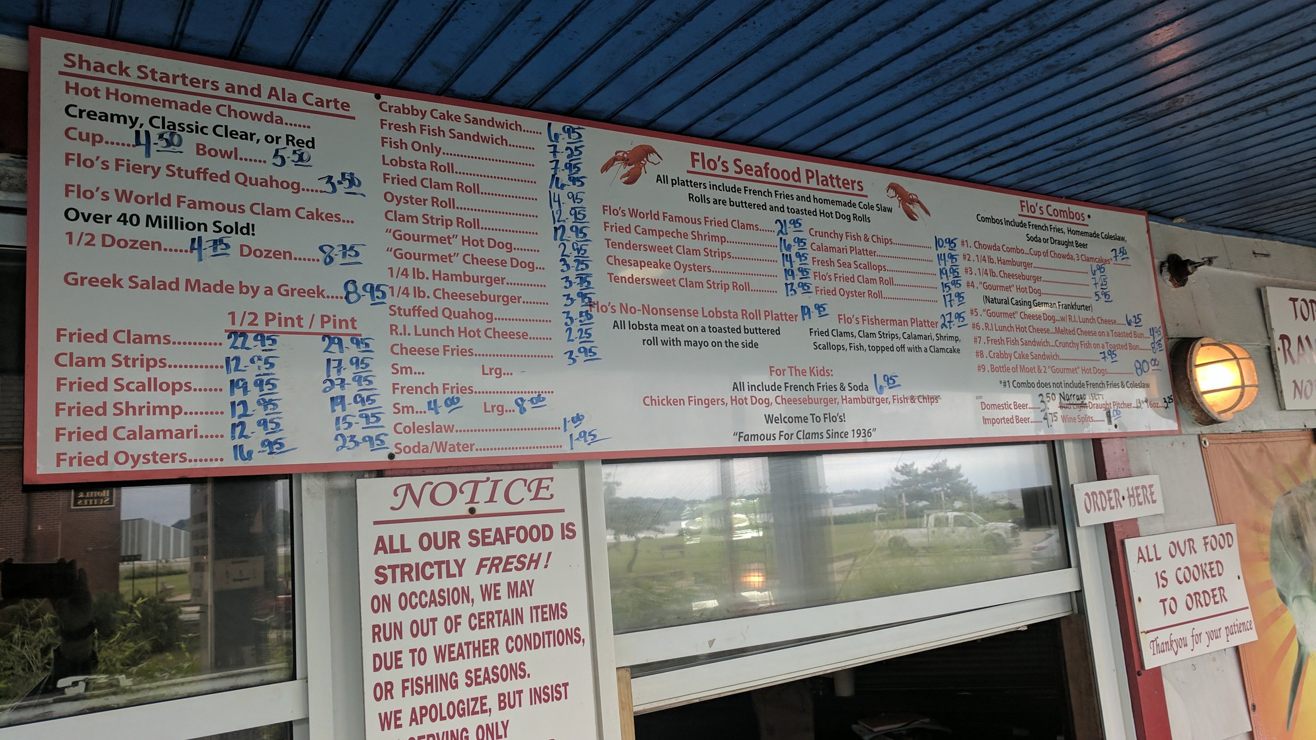 Flo’s is just past Easton Beach. Red tide turns out to be smelly seaweed and not the topic red alge.