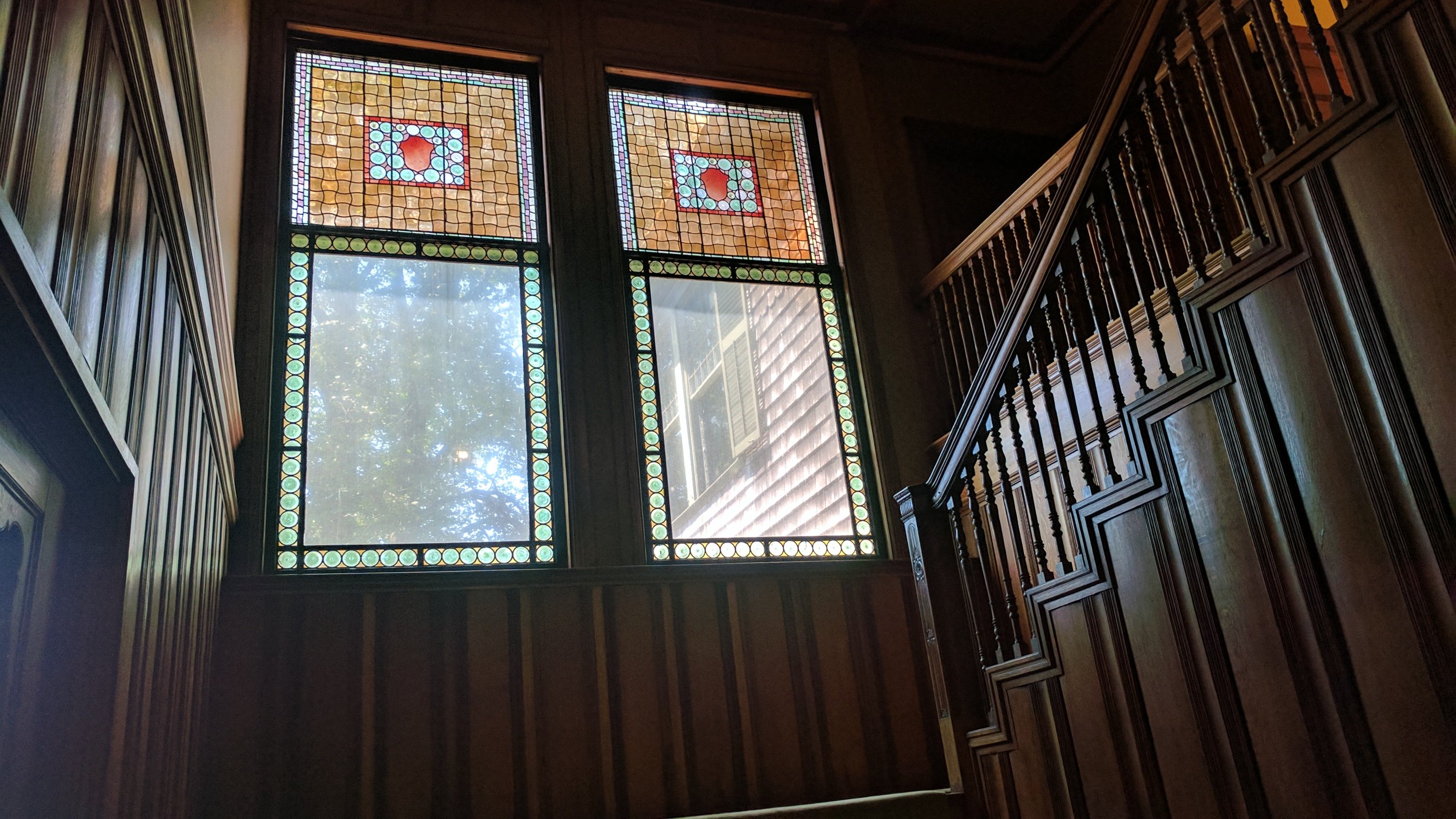 Notice green bamboo painted posts. Uneven front step for carriages exit in the inclement weather.