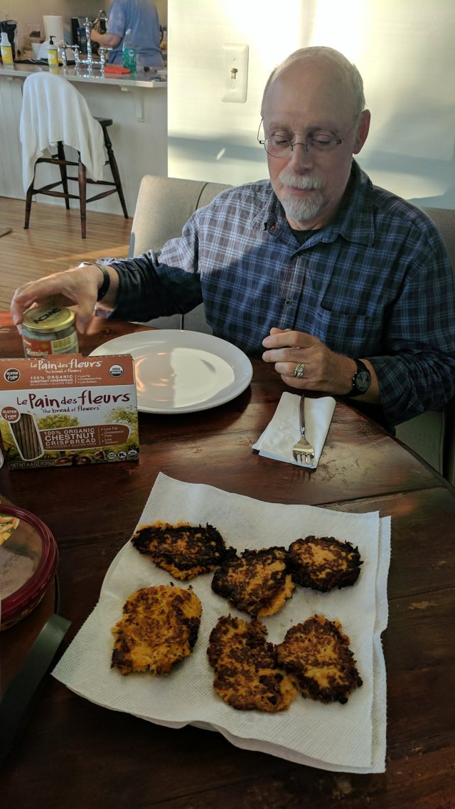 George’s vegetable pancakes; he made these fine tasty treats for dinner. Went well with wine, salad etc.