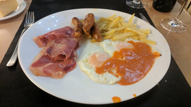 We decided to order a la carte as the media pensión (pre-paid) was of less interest. Had a typical evening meal pictured. I asked for the bill. Ah, it is ok, with a waive of the servers hand. Not the first time in Spain that food was comped when close in price. Never happened in France.