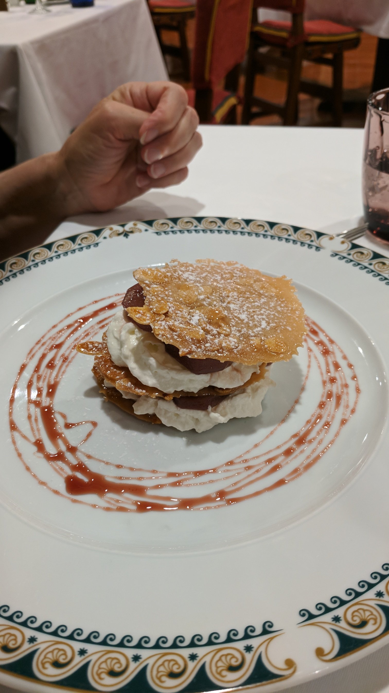 Sheets of caramelized honey and almonds, thinly sliced pears poached in wine with a yogurt based cream that looks like whipped creme. The rest of the dinner was of similar quality.