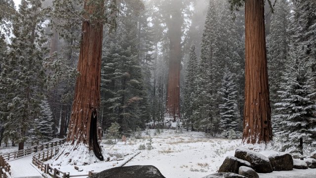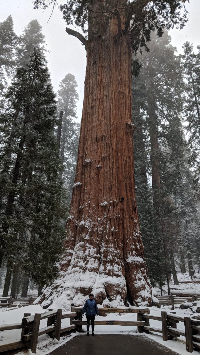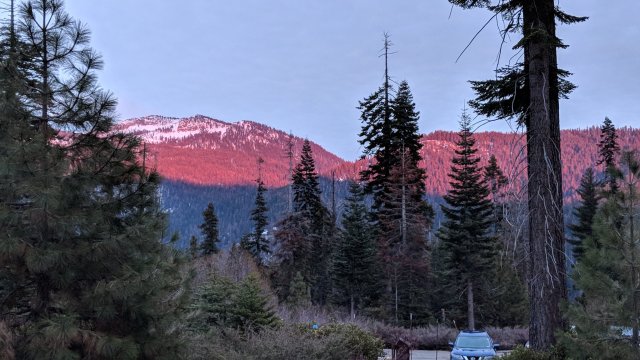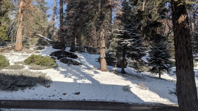Dead trees, snow on the way to Waksachi lodge in the park. Surprised we got a room.