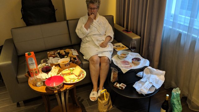 Above is dinner on hotel room. Naturally the power went out where we went for ramen so got a fine picnic of cheeses, prosciutto, salads, wine, good bread. Of course some gazpacho.