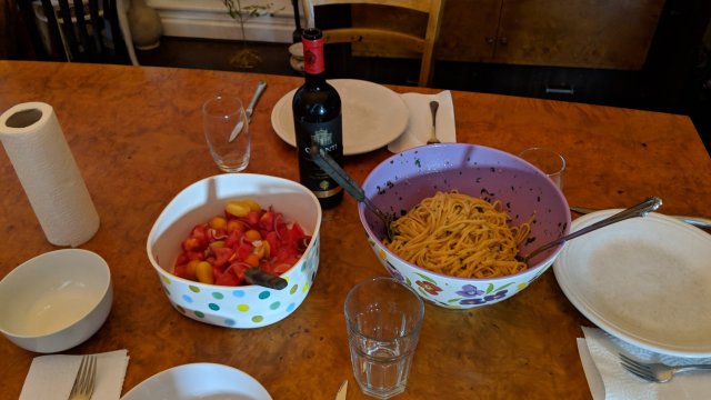 Dinner by Bobby, last minute and perfect. Anchovy sauce, fresh tomatoes. Yummy.
