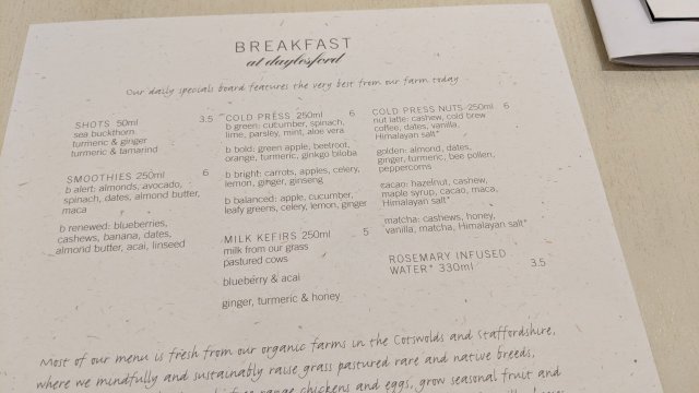 Breakfast at daylesford, a real farm to table with their own farm, offered some very California drinks as starters. We sampled the nut latte. Not a winner.