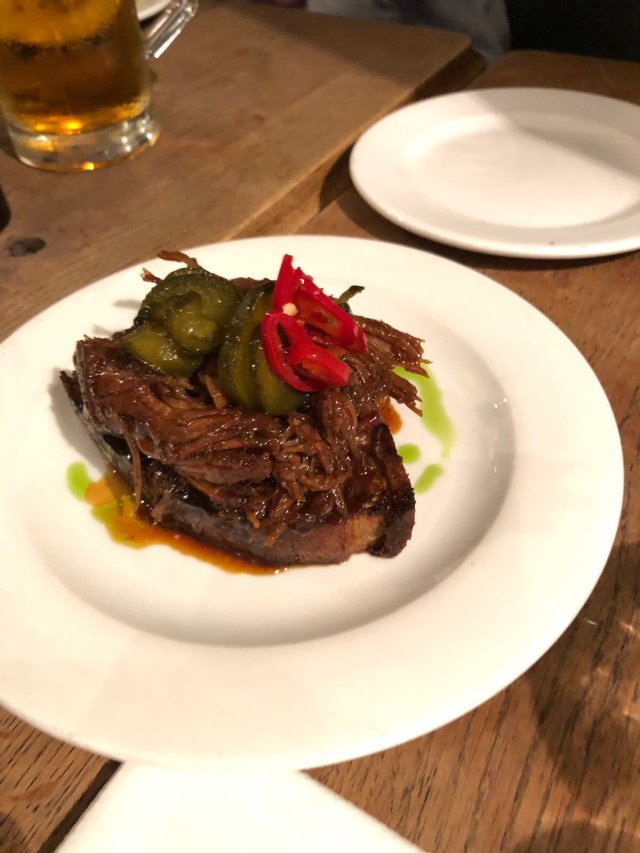 Our aged friends were a bit confused. The so-called A-list was my work buddies and we ate at the excellent Pitcue Restaurant in Liverpool Street. The dish displayed was a luscious bbq’ed lamb with cucumber and chilli pickles on sourdough toast.