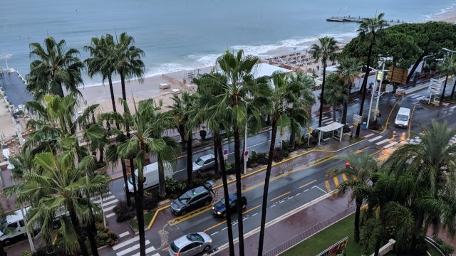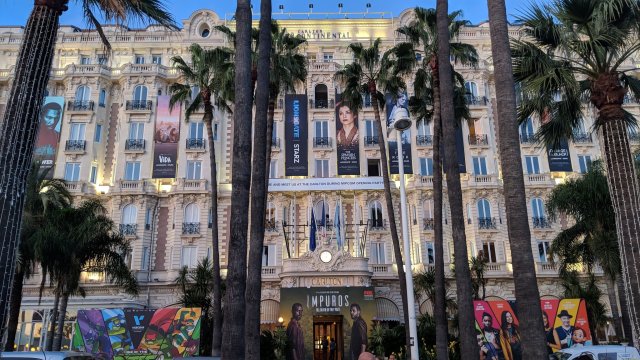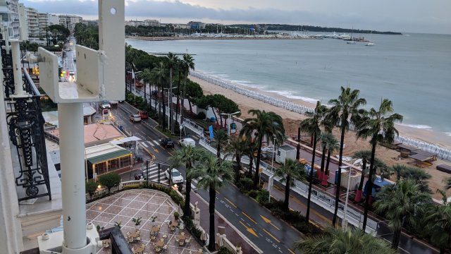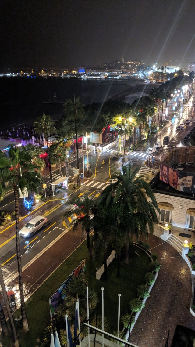 Front of the hotel plastered with TV show signs. Monday mipcom starts (we never heard of it) where 7K to 10K global TV business and entertainment folks will converge. According to the concierge all hotel rooms are fully booked throughout town. If we had tried to come next week we could not have. Entry to the show/convention: 1400 Euro.