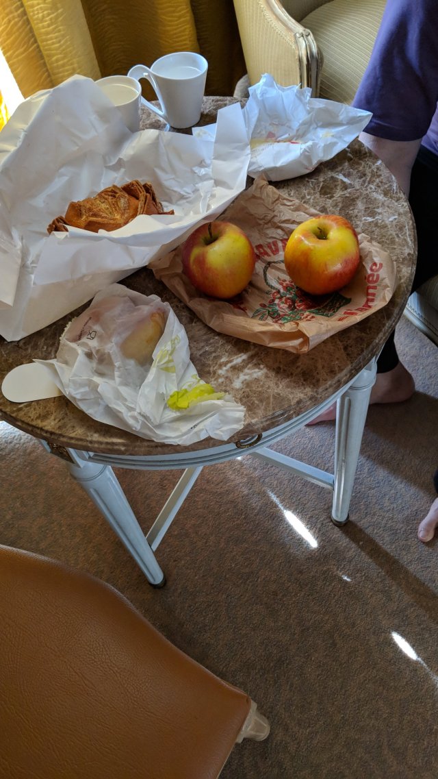 Below, lunch in the room. The piece in the middle is a craquelins, a brioch dough with caramel coating. As good as it sounds. Some bert cheese and apples. Madelines, for later, in the bag.