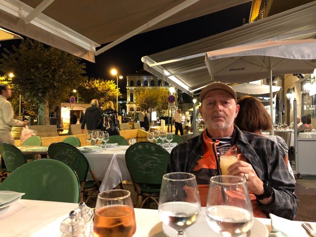 Before a very fine plateau,scallops with risotto for QB. Good people watching along the main drag.