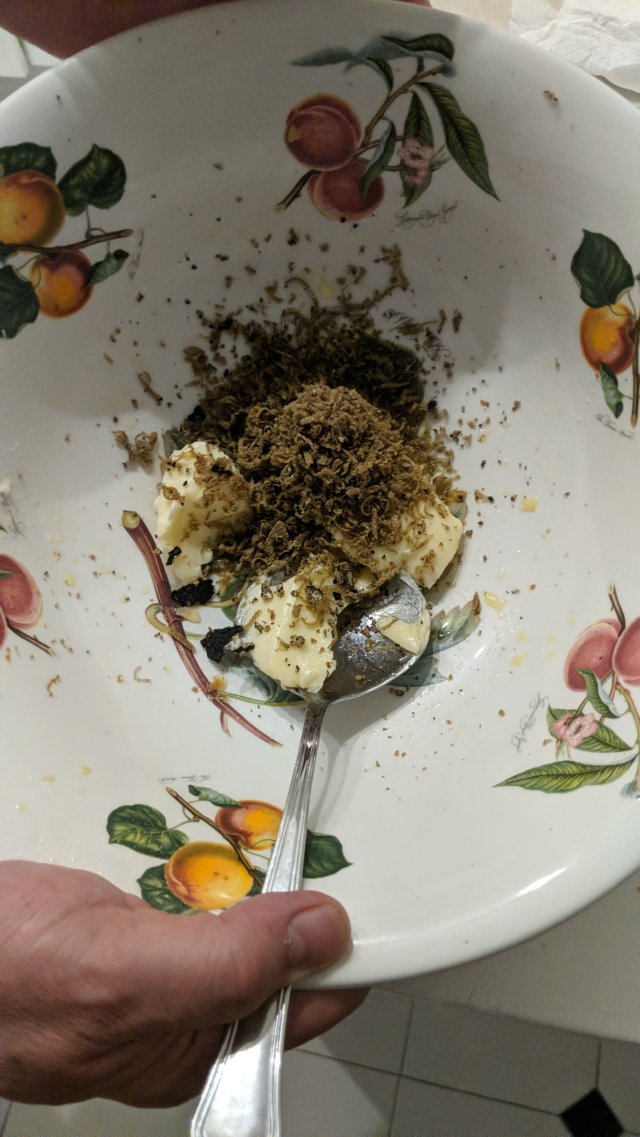 Acquired for dinner. Bobby got some black truffles for a pasta dish. Both types today on pasta, just as they should be served.