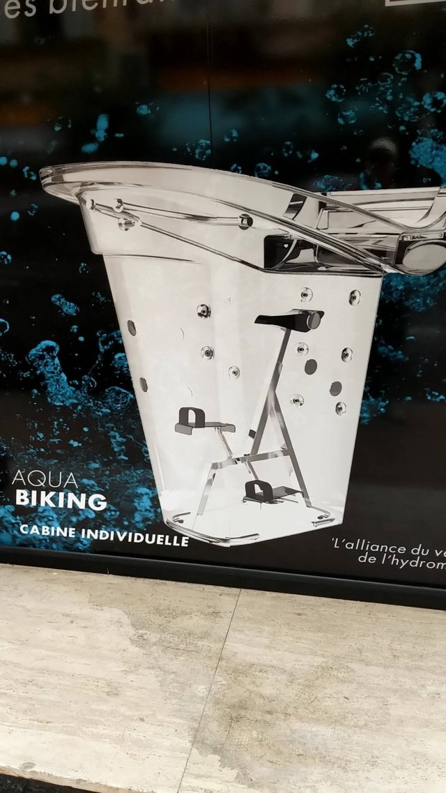 Lots of sporty areas, football, running but this one attracted my eye. You sit in a Jacuzzi and work out. Equipment and result.
