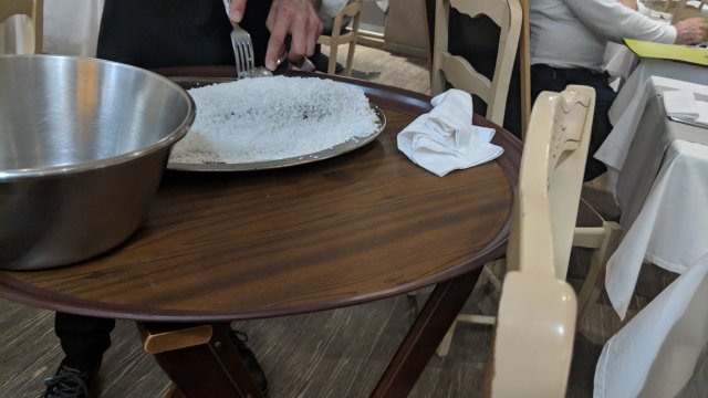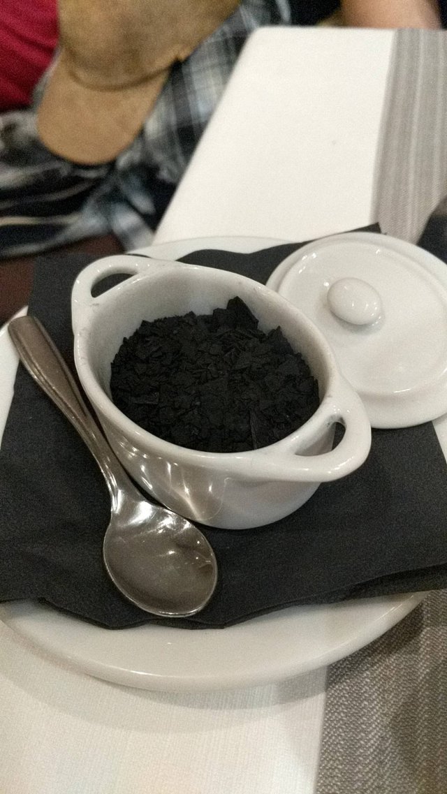 We had the salt baked branzini. First the black salt to sprinkle on. Very crunchy and a nice look.