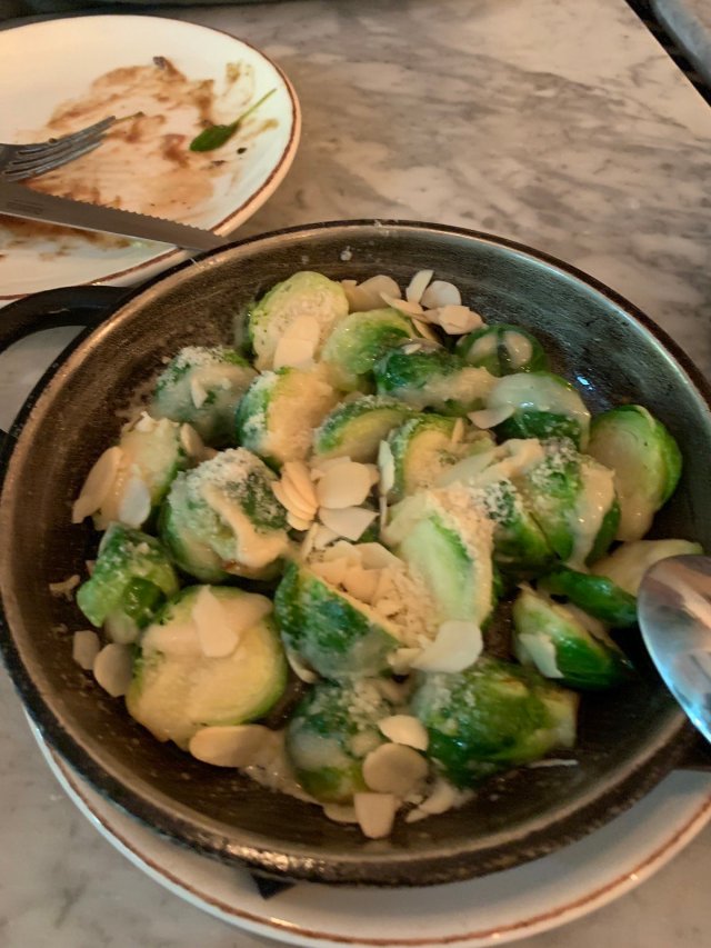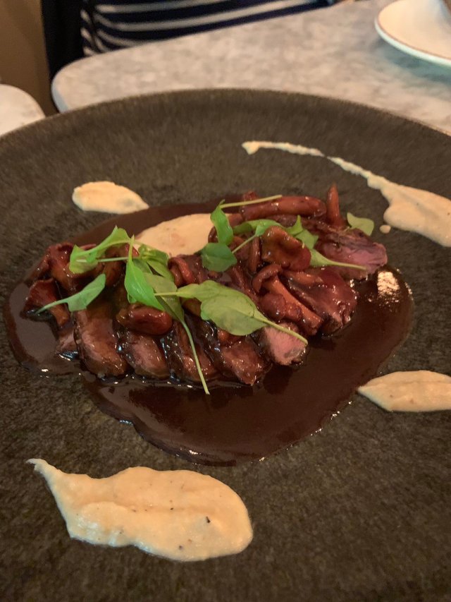 This was followed by Iberico pork loin in demi-glace with burnt mushroom cream. And then wonderfully crunchy, but cooked, Brussel sprouts with almond and parm. Finally there was wagyu steak with girolles mushrooms.