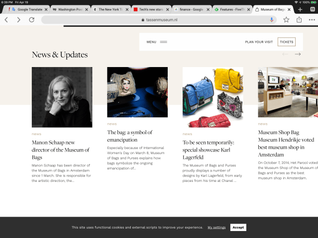 Back in Amsterdam we took Michelles suggestion to visit the handbag museum. Another ball of string. 5000 bags in a canal house of the 17th century. High ceilings, large windows, large ornate fireplace, back yard reminiscent of the Jane Street village brownstone. A good example of why it was called New Amsterdam.