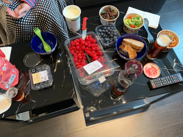 Dinner continues with the same theme. Yogurt/fruit/granola for QB and many salads, Selfridges purchased for KB. Some Doombar as well.