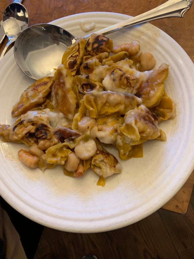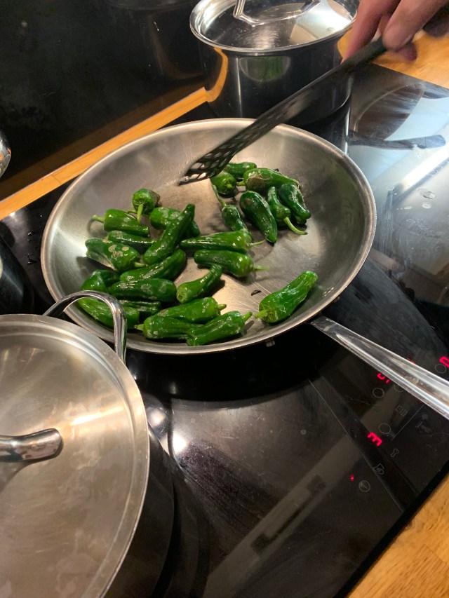 Bobby went all out! Wontons with scallops and shrimp,peppers de padron, fresh chicken broth with added ham into broth for flavoring and filled with thin noodles.