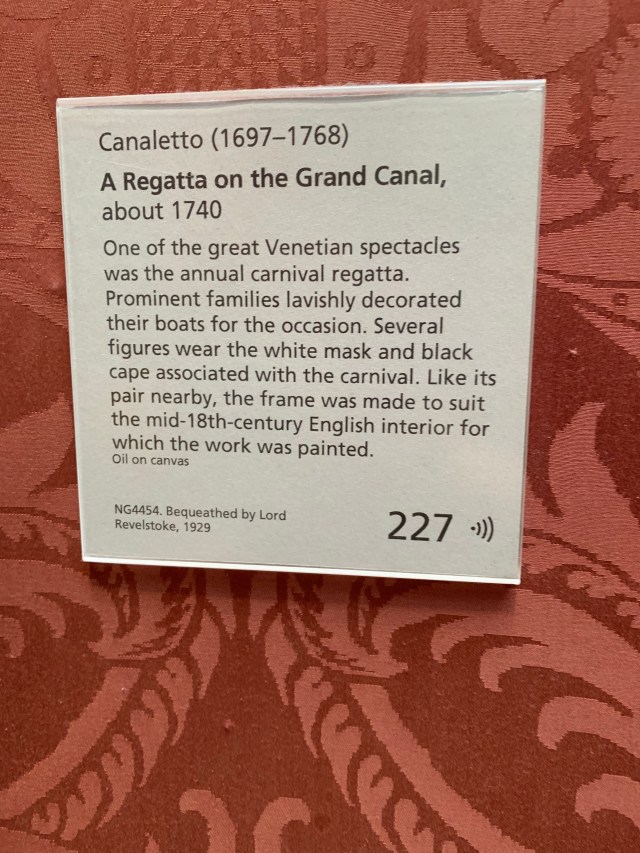 Off to the National Gallery to see Canalettos, Turners and hear a QB pun, a rarity. We went up the stairs and turned left instead of right. “Wrong turn for Turners”.