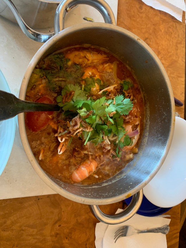 Dinner with Bobby et. al. Tom Yum seafood soup, fine salad, outstanding cabbage dish.