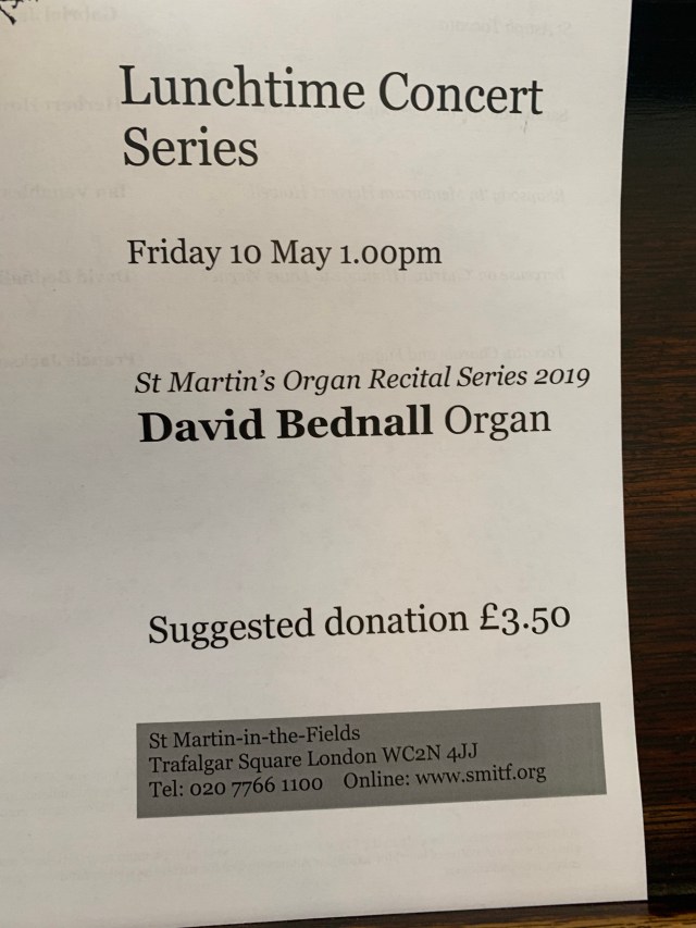 St. Martins in the Field organ concert. A visit and rejection at the National Gallery, and a picnic dinner in the room.