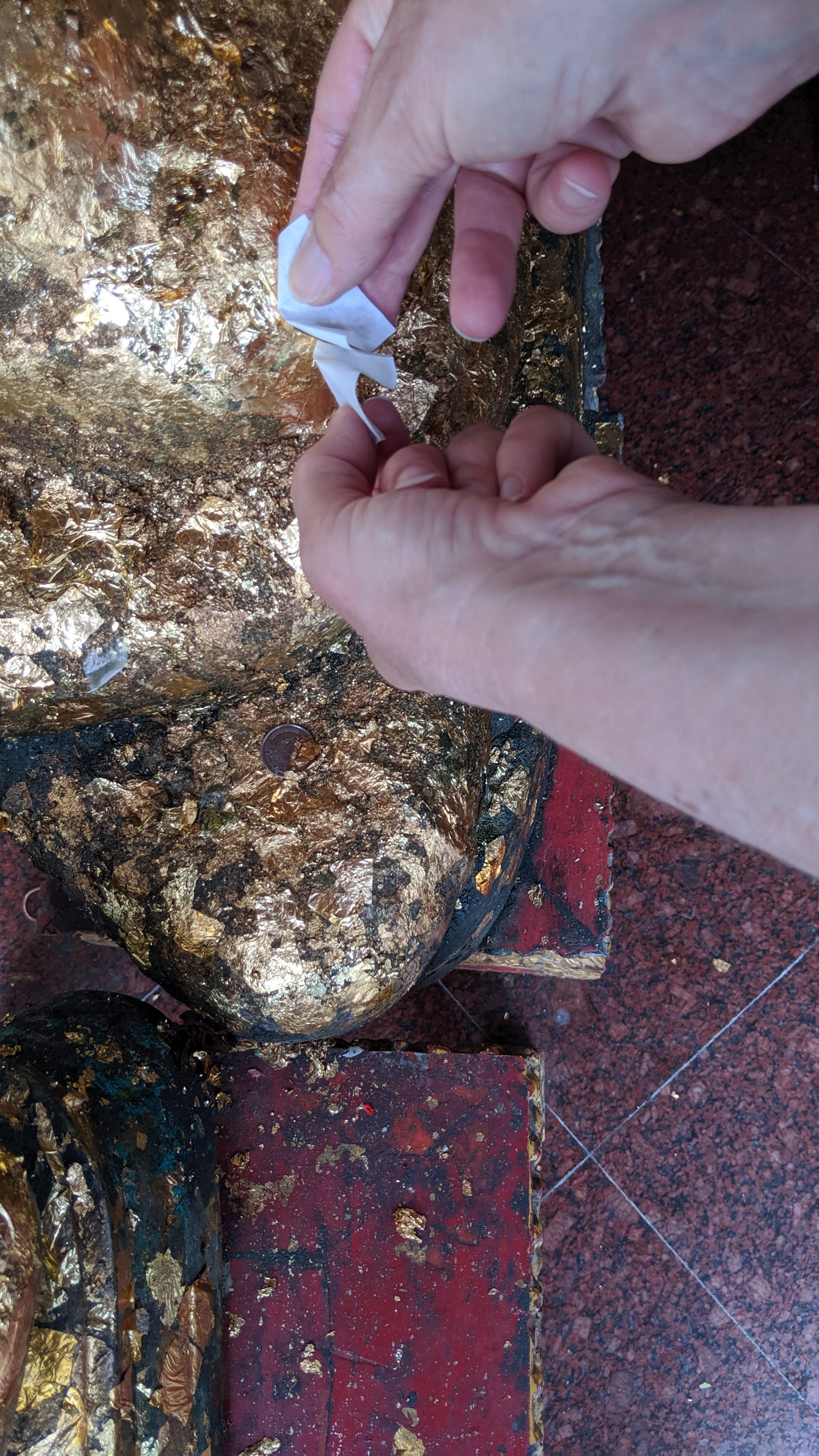 Gold leaf being put on a Buddha by QB. Traditional in Thailand at temples. One buys a small gold foil and applies it. The one pictured has many, including the one by QB.