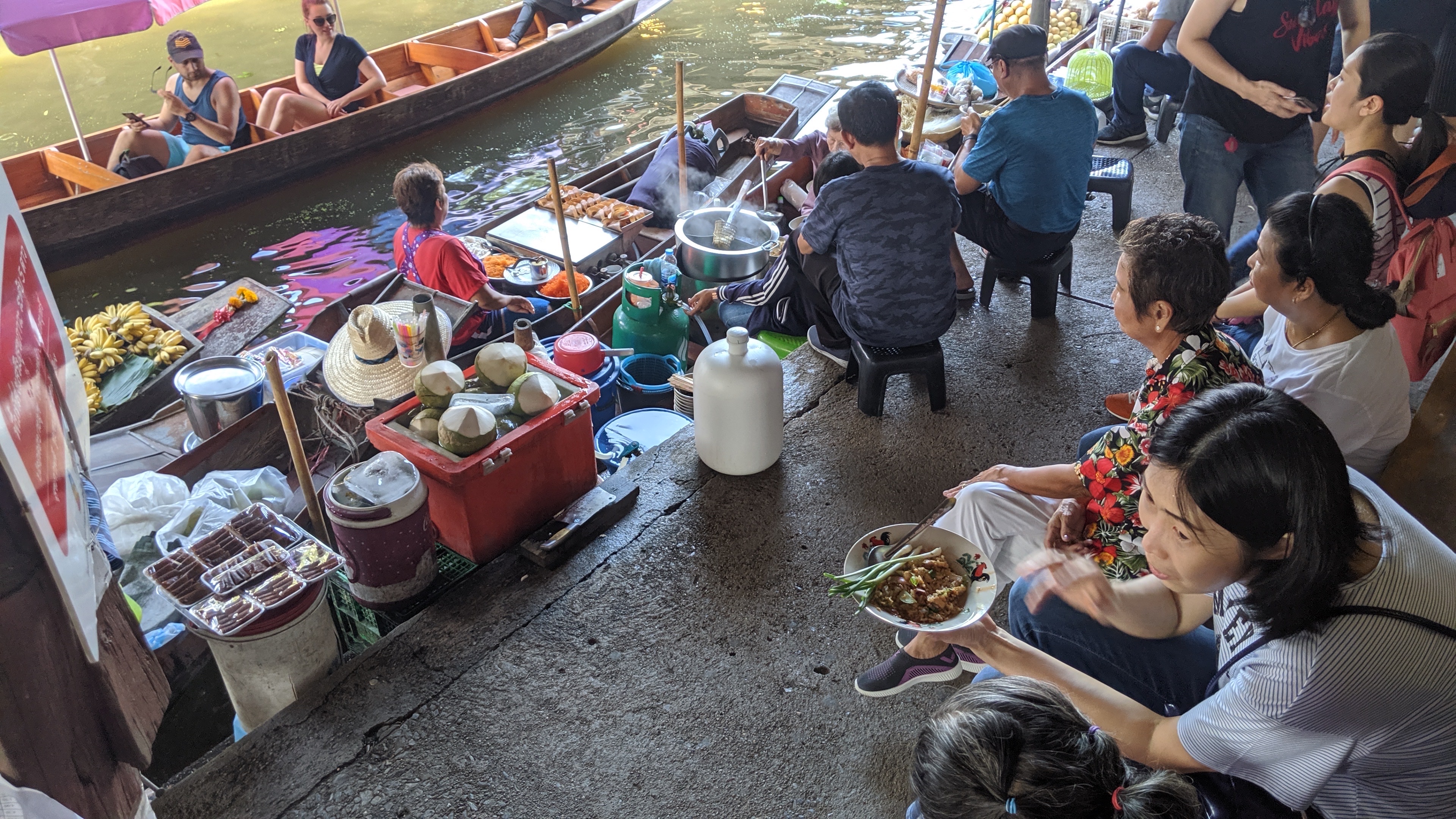 Sunday morning, very early, trip to the floating market in Bangkok. Now quite a way out of town. Used to be close by but faded away when farmers distribution changed to trucks and roads. The market now is far away and mostly for tourists. Maybe 80% tourists. As a side note, 80% of population is still agricultural.
