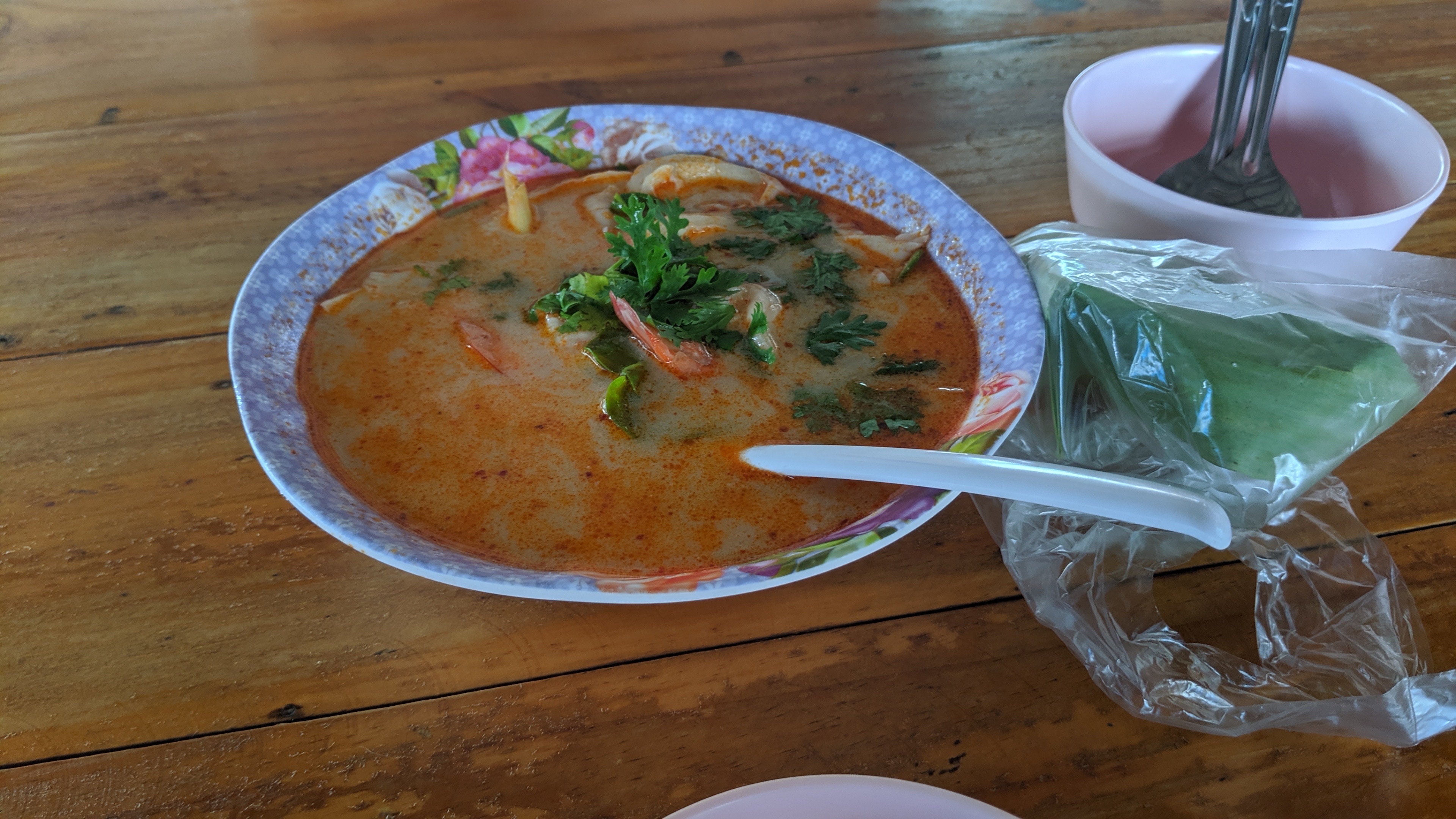 At the floating market street food. Tom Yum pictured but also had fried bananas, covered with rice, and mango slices with sweet rice.