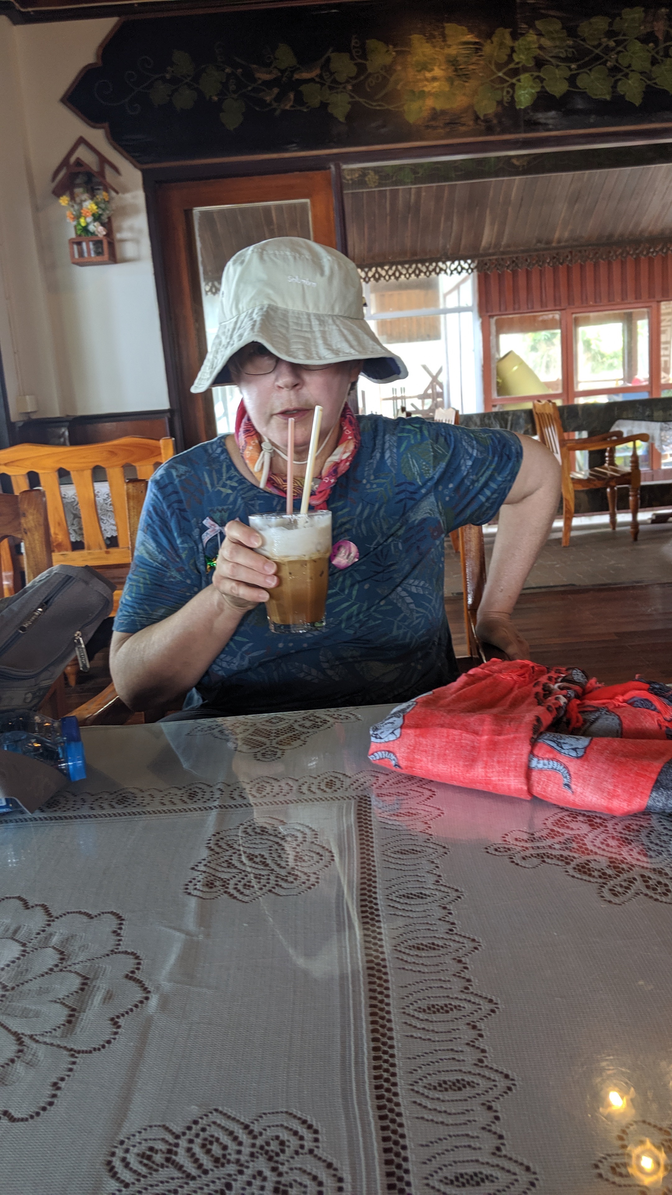 Thai iced coffee on the beach. Quite a process to make, sweet, and good for an occasional treat. Expresso, condensed milk, foamed milk and ice. Lots of stirring during the processing.