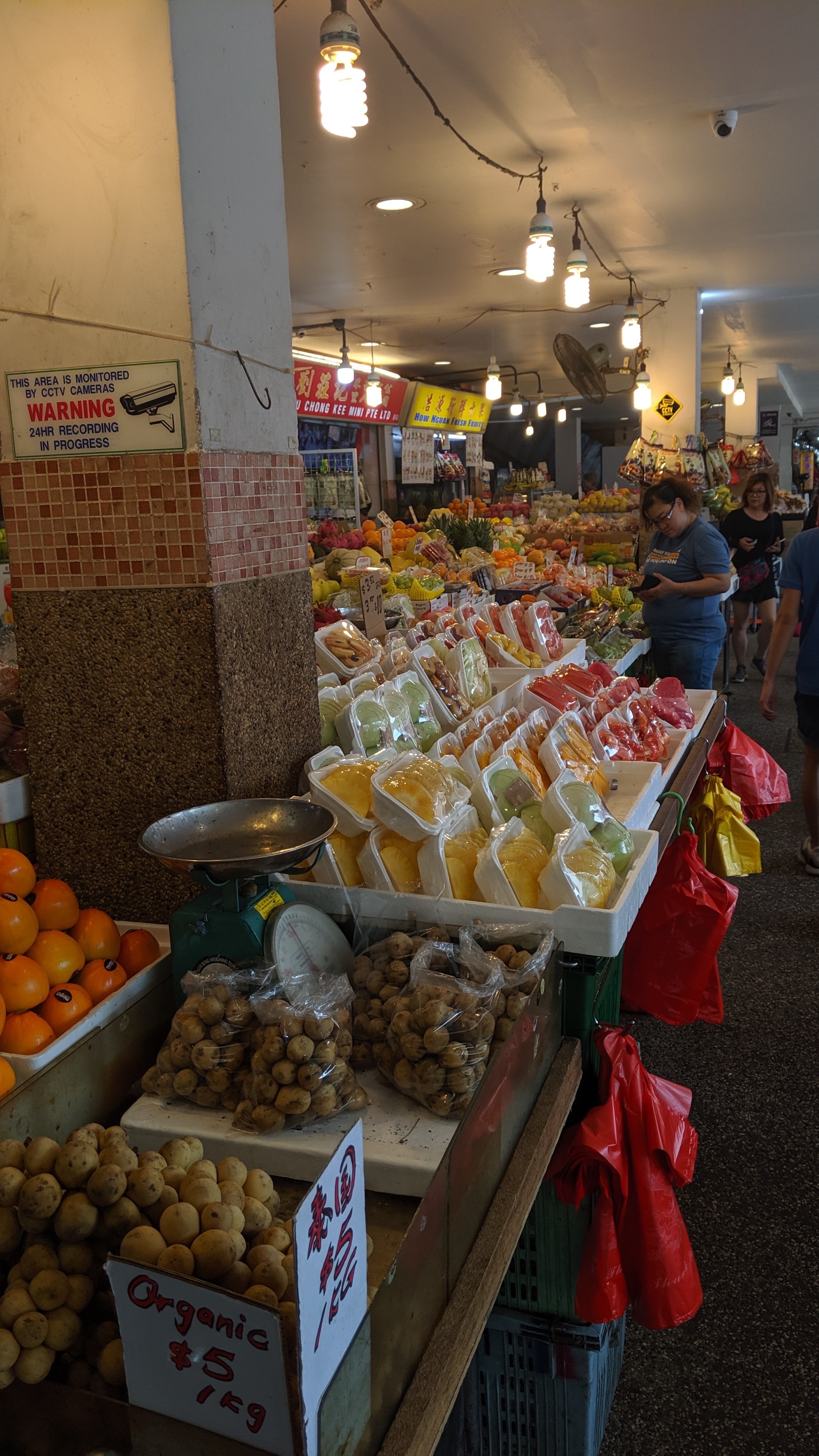 Hawker markets are an outdoor, meaning no a/c, institution here. Some stalls even have Michelin stars and require reservations. Too hot for us to sit outside but great for food browsing. Chinatown very relaxed feeling, no dirty side alleys, wide aisles, easy browsing.