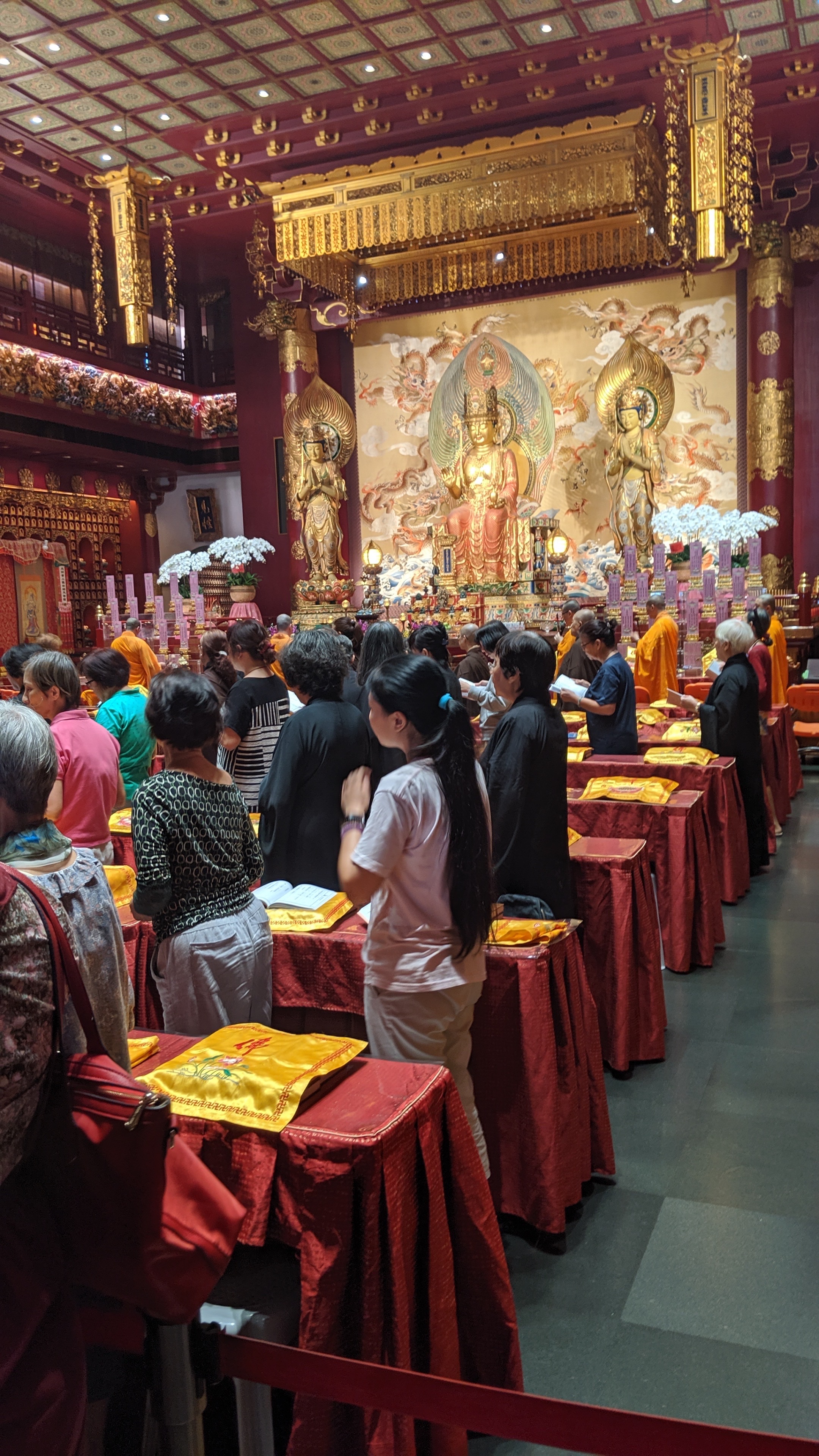Buddha tooth relic temple. We saw it while wandering about Got to see a chanting ceremony, in Mandarin, with an variant style of Buddhism. Have video in phots but will not play in blog. Shoes on, oddly for us.