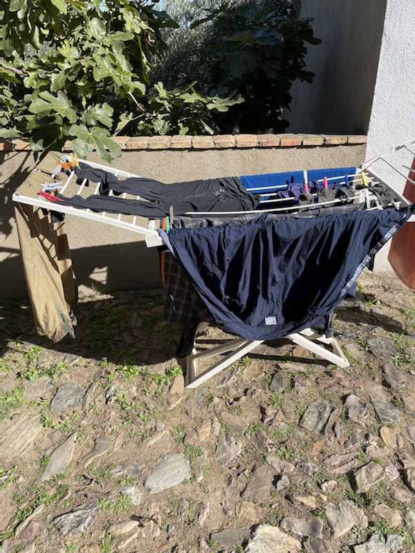 The accommodation is in an albergue. We have the only couples room, the other rooms have bunk beds, one large room with 10 beds a few rooms with just bunk beds. In the courtyard, here, many chickens, sheep, large dog, and a horse. They shared the outdoor laundry facility. Hand washing and sun drying. Others at the albergue sharing same.
