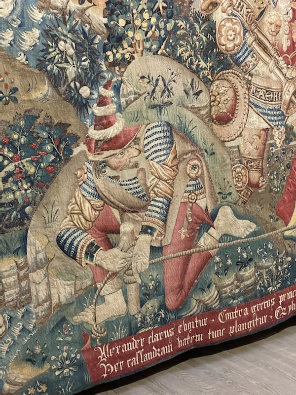 The kneeling guy in the tapestry us reminiscent of a Christmas elf – any clue as to the myth? Further detail on scallop prep for dinner? Hope that healing to endure walking continues for Sharon.