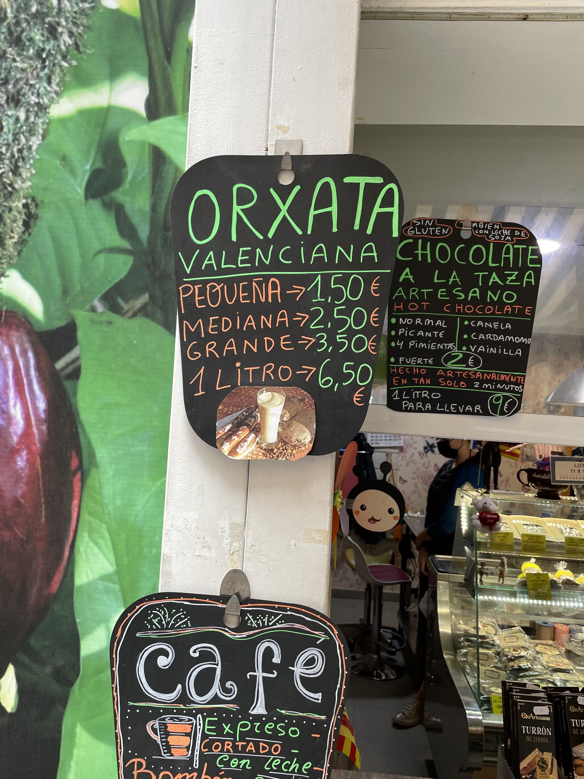 We tried a small orxata. Chufa, sugar (much) water. Sweet, very popular here, lots of shops sell it.