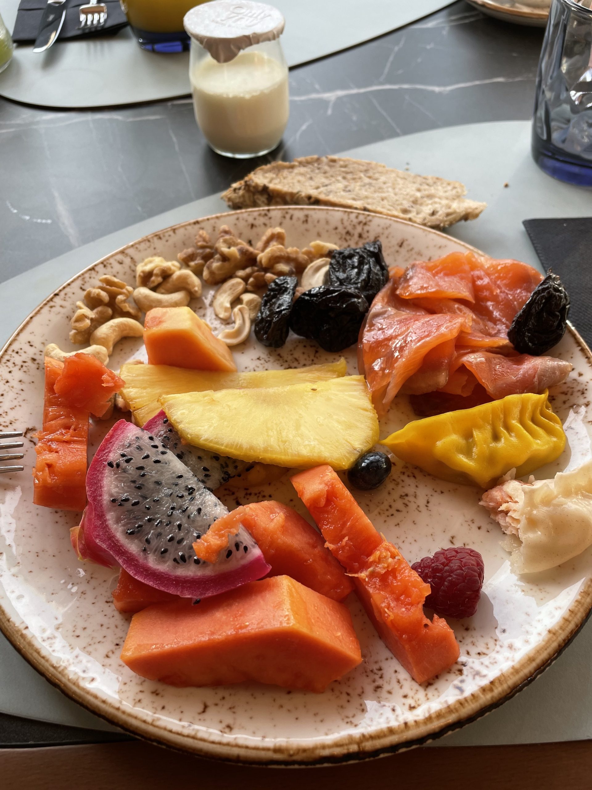 Picture of perfect KB breakfast. Some variant on this theme each breakfast day. Even better than it looks. Great hotel, one of the best we have stayed at.