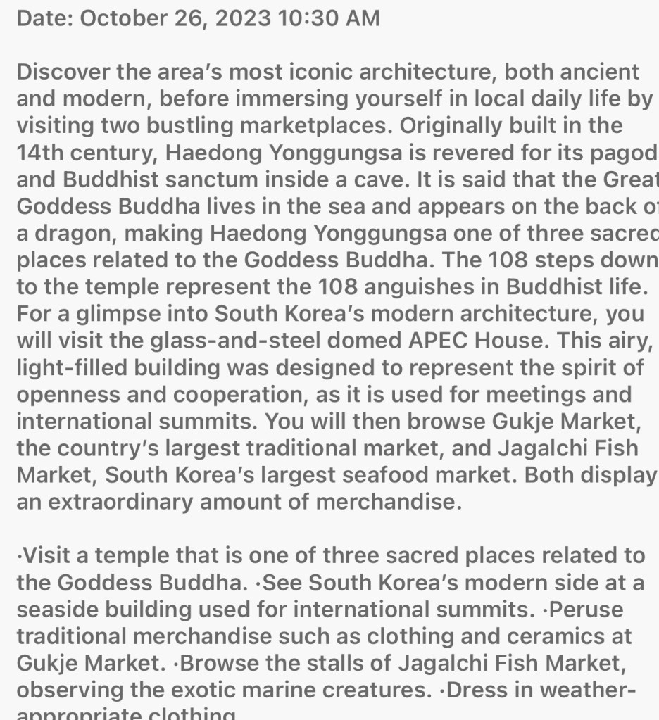 We elected for the 6 1/2 hour excursion. We picked a long one with lots of bus riding and apparently a good deal of walking and many steps. The main reason we picked this is it included a city tour in addition to a temple and the fish market, and another market, local street market.