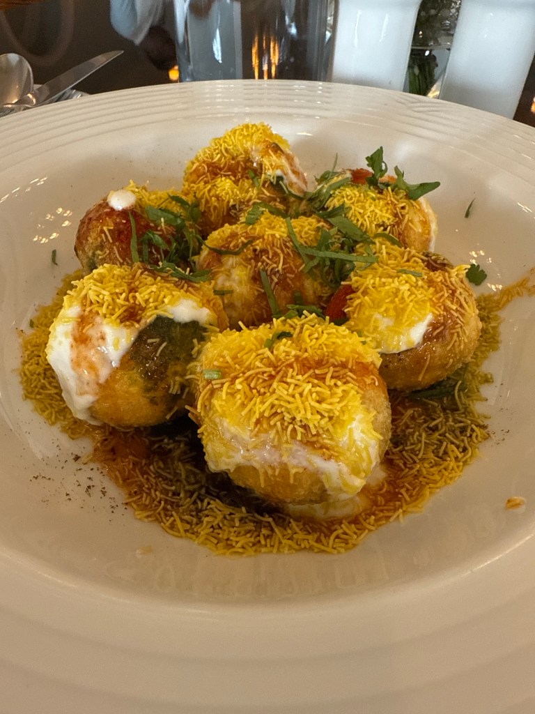 Dahi Batata Puri (Puffed puris, potatoes, dry mango chutney, green chutney, sweet curd, vermicelli)