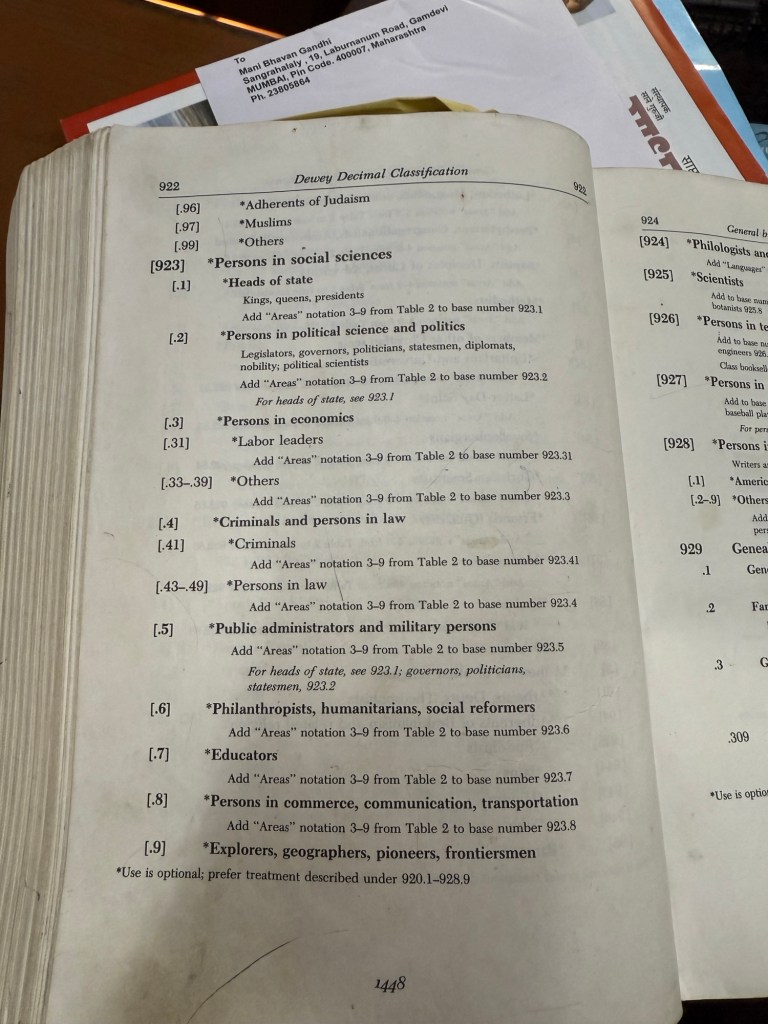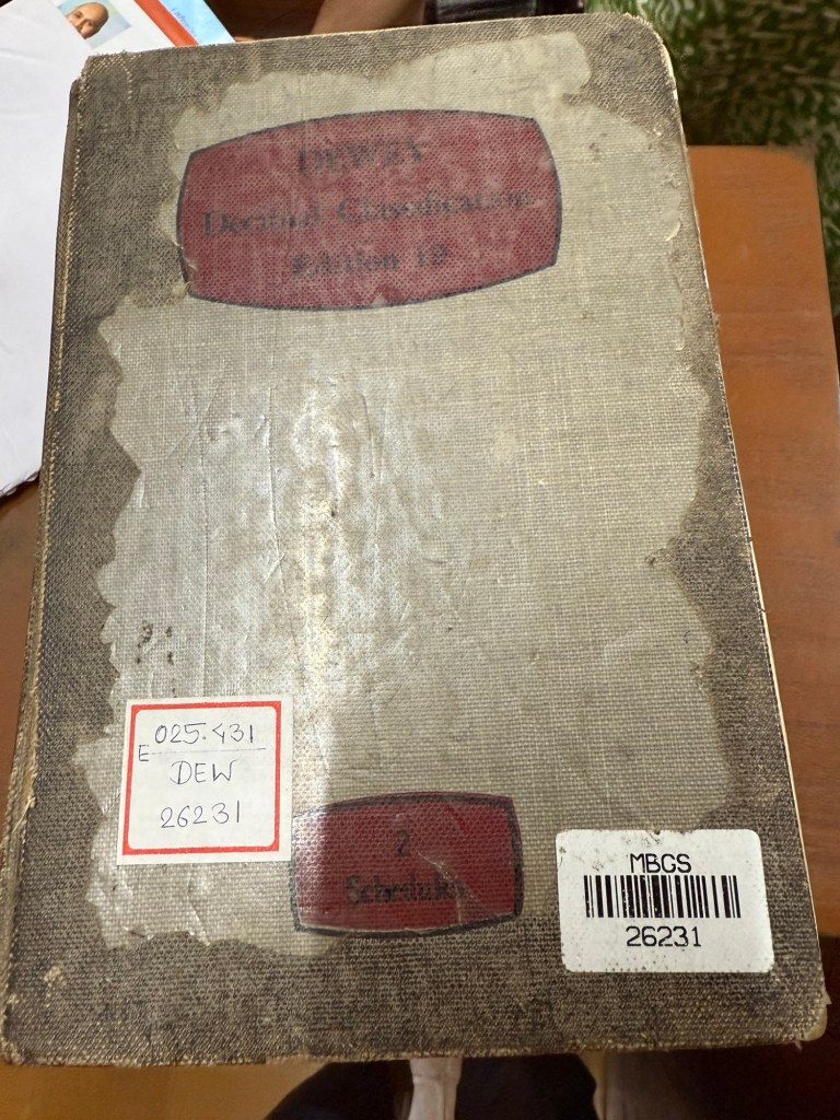 I separated from the group to understand how the library was organized and what system they were using. As you can see in the picture they are numbered, looking like the Dewey decimal system with the name of the author generally under the Dewey modified system. Claimed to have taken the British system, modified a little bit by the American system and then modified it a little bit more. The book has the layout of the notification system.