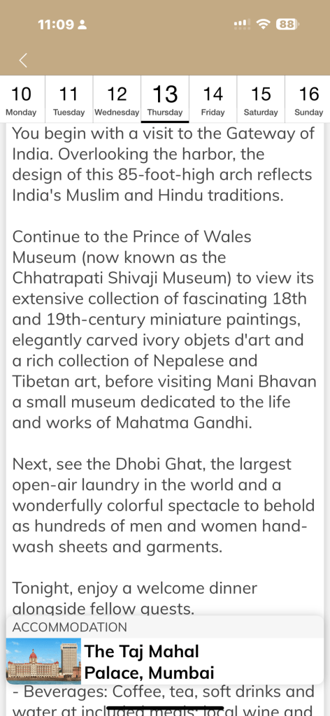 Food may not turn out to be as I hoped. He explained that each meal is set; you can ask the wait staff to make it spicier or not spicy, but it’s set to be non-spicy. Sometimes it’s Mediterranean sometimes it’s Italian occasionally it’ll be Indian. Clearly not a food oriented tour.