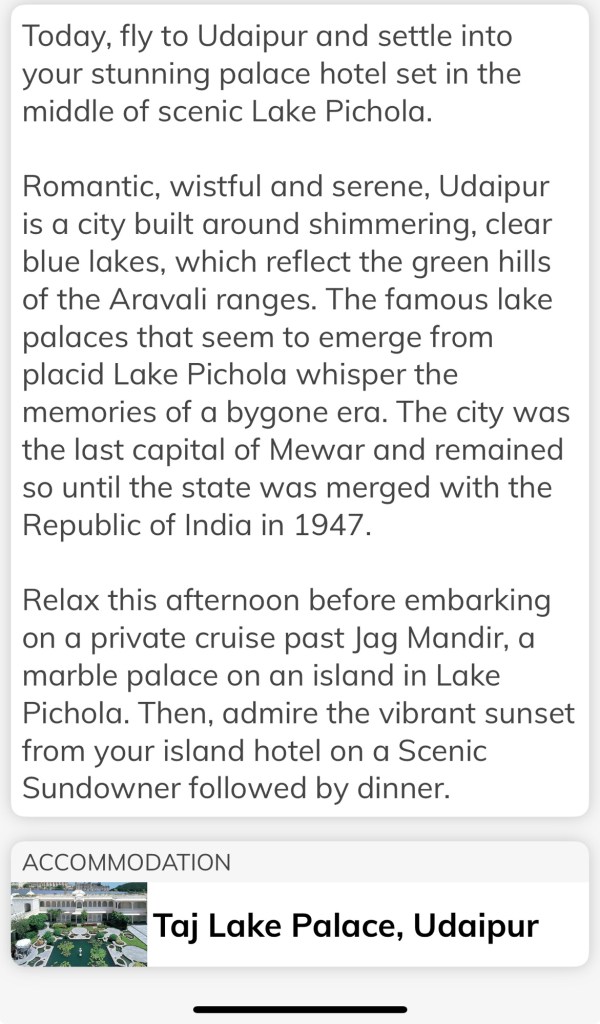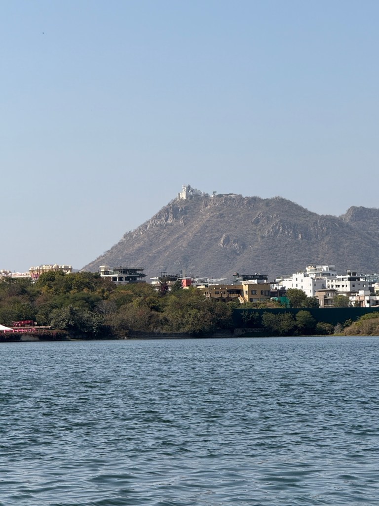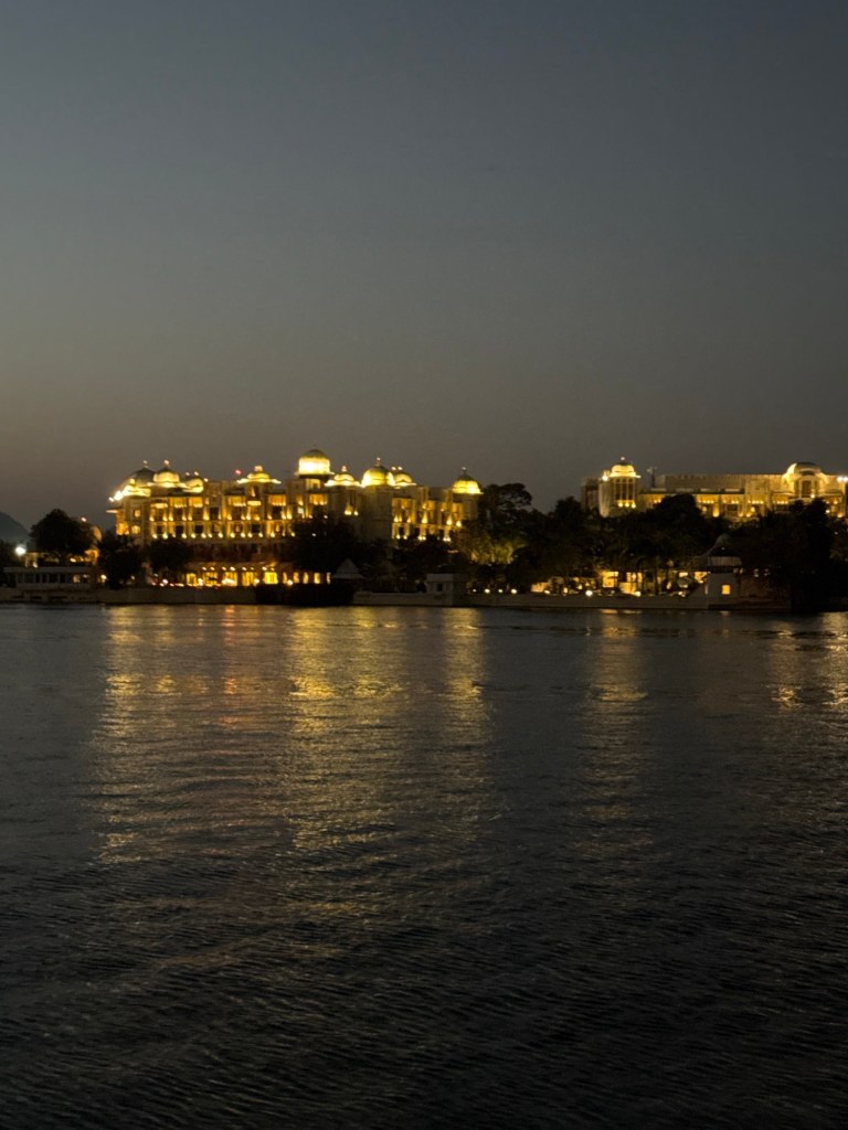 Air India flight to the hotel. The hotel is a royal palace, so it was 250 years ago that there were actually three palaces: one for summer, one for winter, and one for the monsoon, all located on the lake, as pictured in the monsoon section. One of the palaces is situated high on a hill above the monsoon clouds.