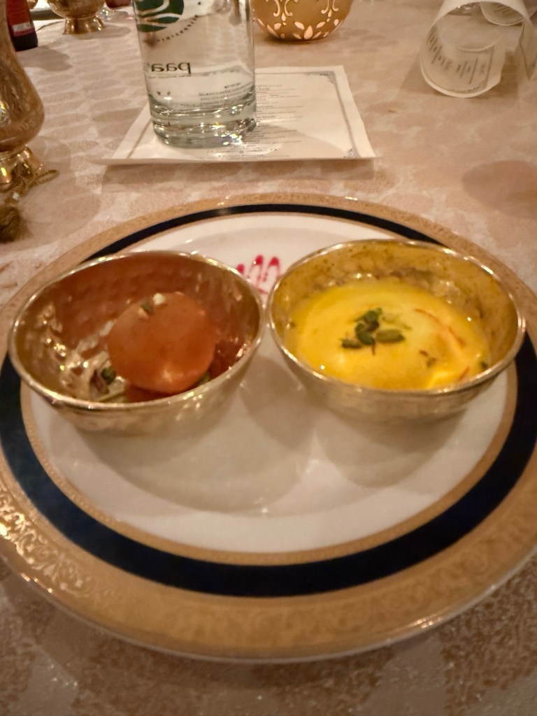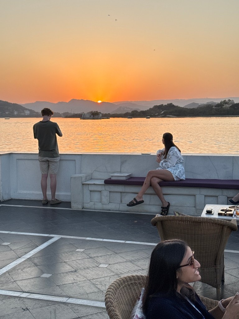 Sunset dinner, Indian food. I asked the guide about the difference between the food in Mumbai and here in Rajasthan in this latter area it tends to be spicier.
